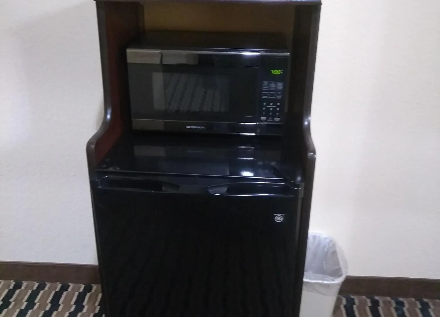 The room has a microwave, a mini fridge, and coffee and tea making facilities as well.